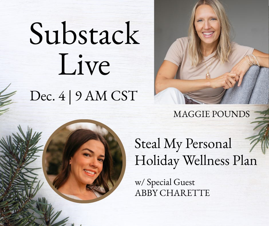 Substack Live | December 4 at 9 AM Central - Steal My Personal Holiday Wellness Plan - I’m so excited to host this conversation with my new Substack friend Abby Charette - Really Well.